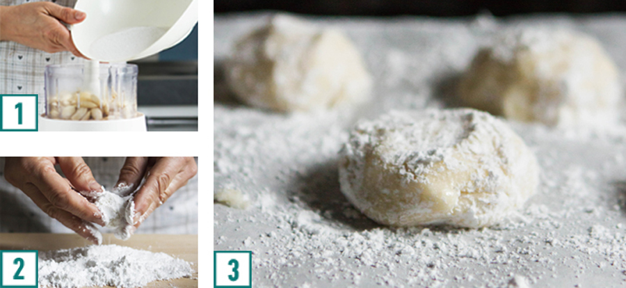 Lavorare l'impasto formando delle palline della dimensione di una noce, appiattirle leggermente e “impanarle” nello zucchero a velo (2).