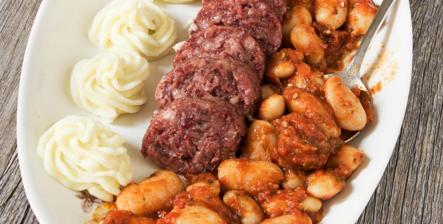 1 cotechino fresco da 600 g - 300g di fagioli bianchi secchi tipo spagna - 1 spicchio di aglio - 1 costa di sedano - 1 carota - conserva di pomodoro - 1/2 kg di patate - 150 ml di latte - 40gr di burro - noce moscata - parmigiano grattugiato - olio, sale, pepe