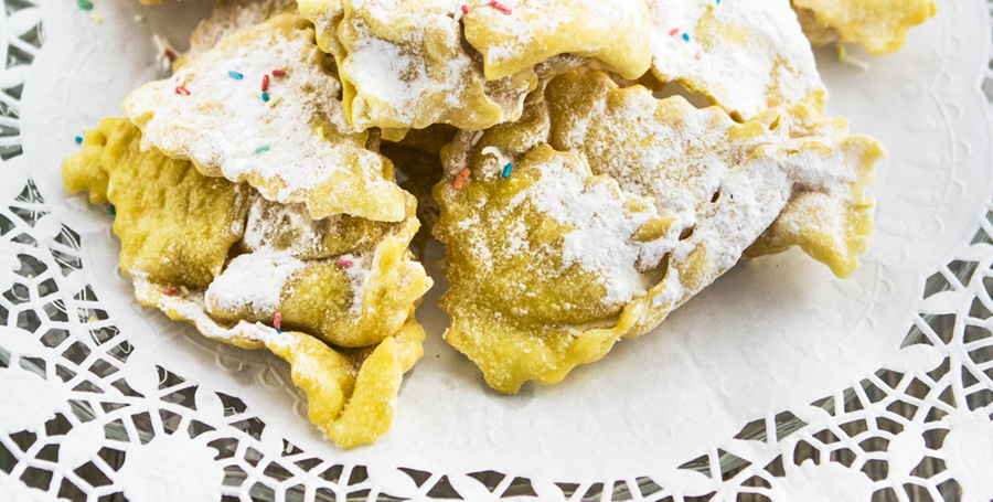 500g farina - 5 tuorli d'uovo - 90g di zucchero - 25g di burro fuso - 1 bustina di vanillina - 2 cucchiai di sassolino - 1 litro di olio di arachidi - zucchero a velo qb - sale - scorza grattugiata di un limone
