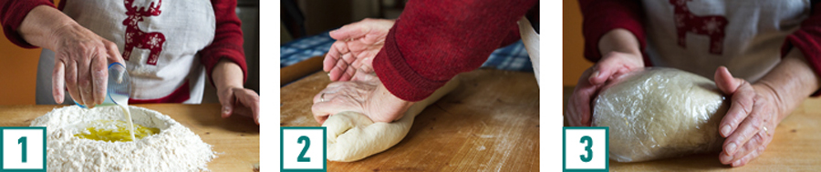 Su di una spianatoia disporre la farina a fontana e versare a l centro il sale, l'olio e il latte (1). Con una forchetta amalgamare il tutto alla farina, quindi lavorare gli ingredienti fino ad ottenere una palla di pasta omogenea (2). Ricoprire con pellicola trasparente e lasciare riposare in frigorifero per almeno un paio d'ore, perché la consistenza dell'impasto diventi elastica (3).