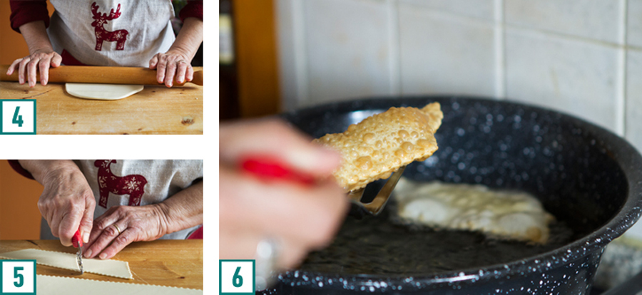 Trascorso il tempo di riposo riprendere in mano la pasta e iniziare a stenderla sulla spianatoia con l'aiuto di un mattarello fino a renderla sottile qualche millimetro (4), perché una volta immersa nell'olio tenderà a gonfiarsi, generando le classiche bolle). Con l'apposita rotella o con un coltello affilato tagliare la pasta a forma di rettangoli o losanghe di circa 10 cm di lunghezza (5).