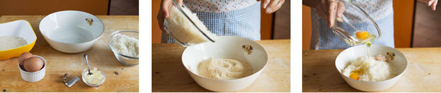 In una terrina mettere il pangrattato, il parmigiano e le uova ( se si desidera prima si possono sbattere con un pizzico di noce moscata e uno di sale ).