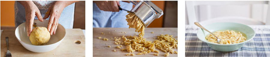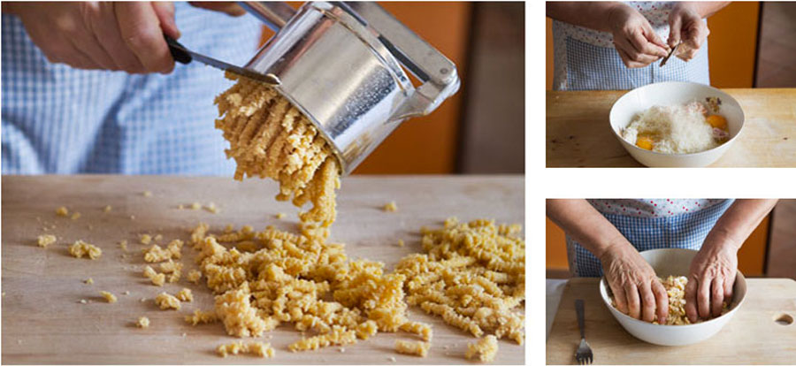 Mettere l'impasto dei passatelli dentro uno schiacciapatate con i fori larghi e schiacciare facendo fuoriuscire dei "vermicelli" di circa 4 cm di lunghezza.