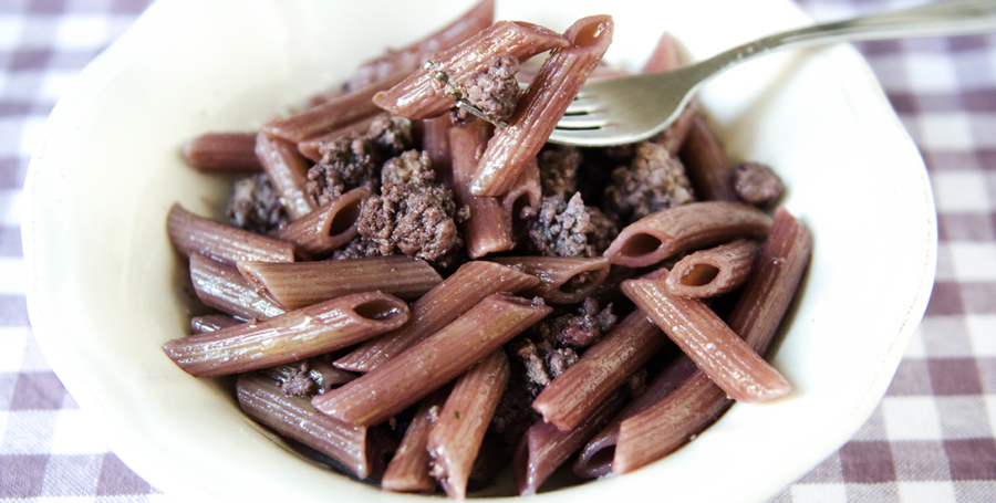1 cipolla piccola (o scalogno) - 400g di maccheroni o penne - 200g di ragù di salsiccia - 1 bottiglia di lambrusco - acqua - parmigiano - sale q.b. - pepe q.b. - panna (a piacere)