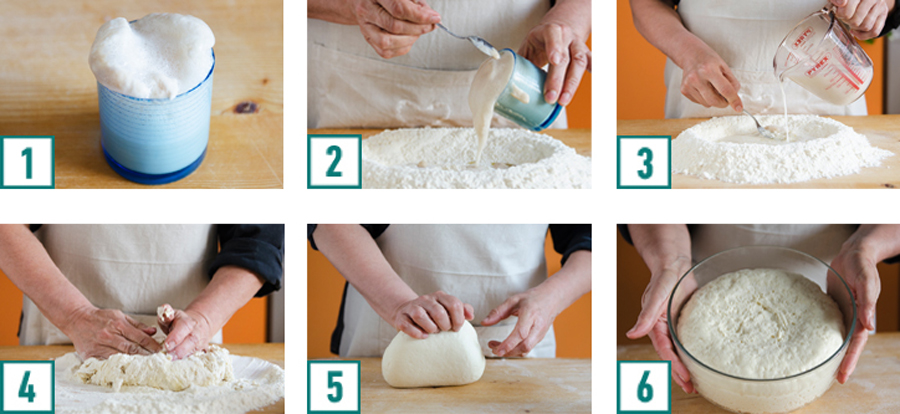 Su una spianatoia disporre a fontana la farina e aggiungere al centro il lievito (2), il latte e il sale (3). Impastare bene tutti gli ingredienti (4) fino a formare una palla liscia e compatta (5).