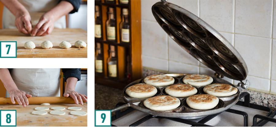 Lavorare l'impasto creando tante piccole palline della dimensione di una noce (7). Stendere ogni pallina col mattarello per ottenere dei cerchietti di pasta dello spessore di mezzo centimetro(8).