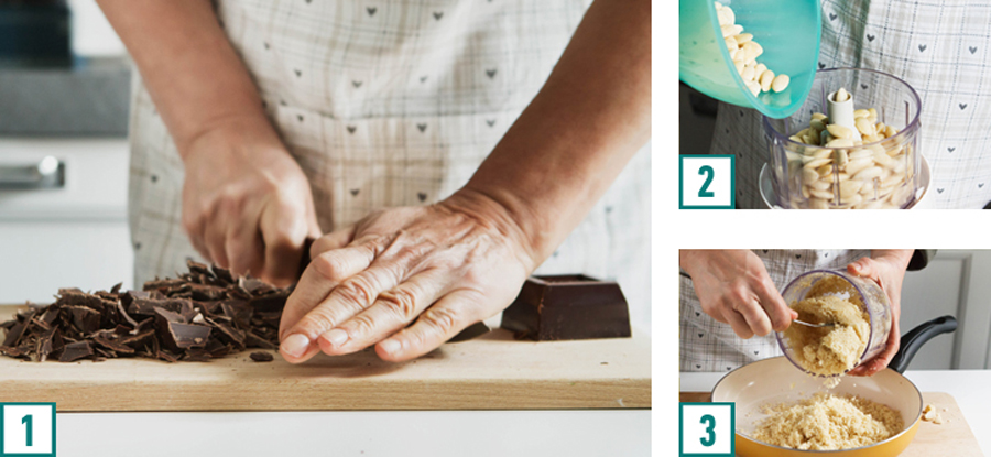Tritare finemente le mandorle aiutandosi con un mixer (2), quindi tostarle in una padella antiaderente a fuoco basso (3).