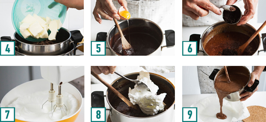 Separare i tuorli dagli albumi e aggiungere i tuorli al composto (5). Amalgamare bene e aggiungere le mandorle, il sassolino, il caffè e il suo fondo (6). Montare a neve gli albumi (7) e incorporarli mescolando delicatamente (8).